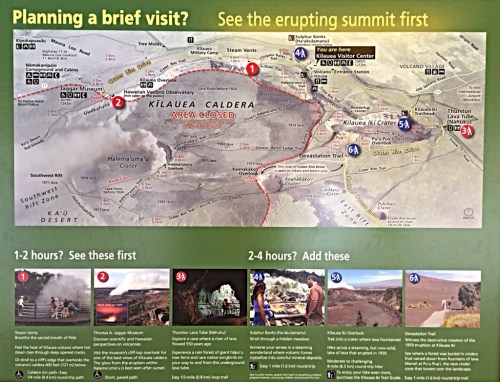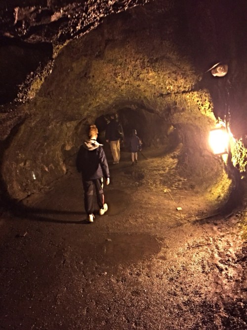 You can drive around the caldera on Crater Rim Drive (at least until a section where the road has been closed due to dangerous volcanic activity) and you can drive down through the outpourings in the East Rift Zone on Chain of Craters Drive. We arrived around 5pm after 3 hours of driving from the east coast and first stopped at the Visitor Centre. Here we found helpful suggestions for three main things to see and do over a couple of hours: (1) “breathe the sacred breath of Pele” from steam vents, (2) view Kīlauea’s erupting summit from the lookout at the Thomas Jaggar Museum, and (3) “explore a cave where a river of lava flowed 550 years ago”.
