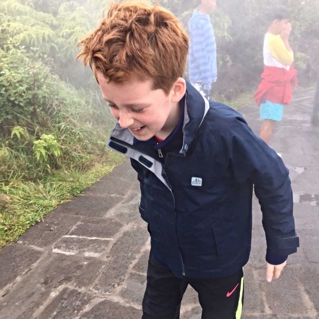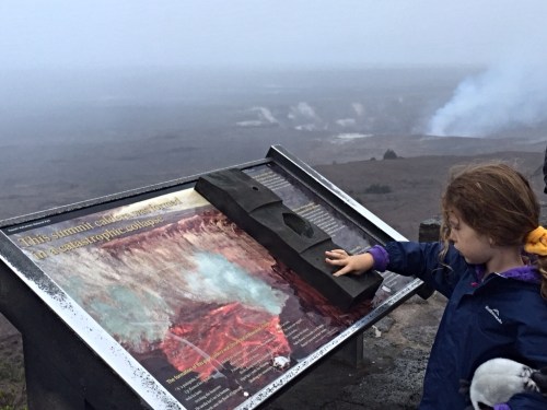 First to the lava vents! Just off Crater Rim Drive we saw plumes of steam rising from cracks that have opened in the ground, venting from the volcano far below. As you can see from Oliver’s red face in the photo below the steam was very hot and wet. If it was Pele’s breath, according to Louisa, she smells sweet like pancakes. Oliver and Louisa threw coins into the vents. Their pennies joined many coins and other offerings, supposedly to appease Pele and quieten her fiery rumbles.